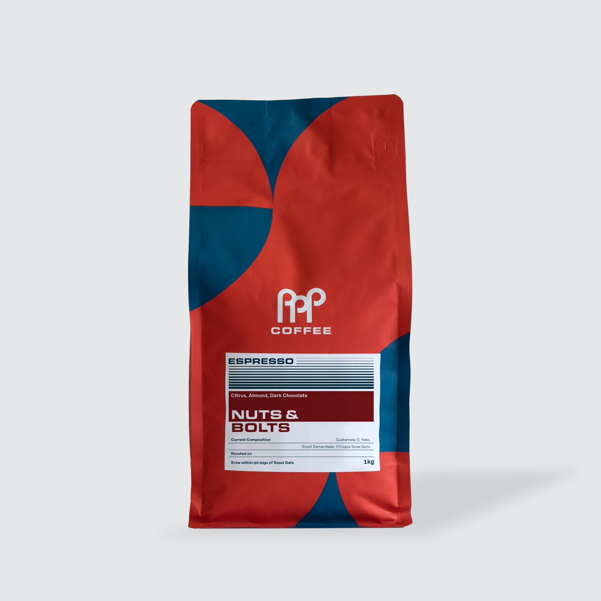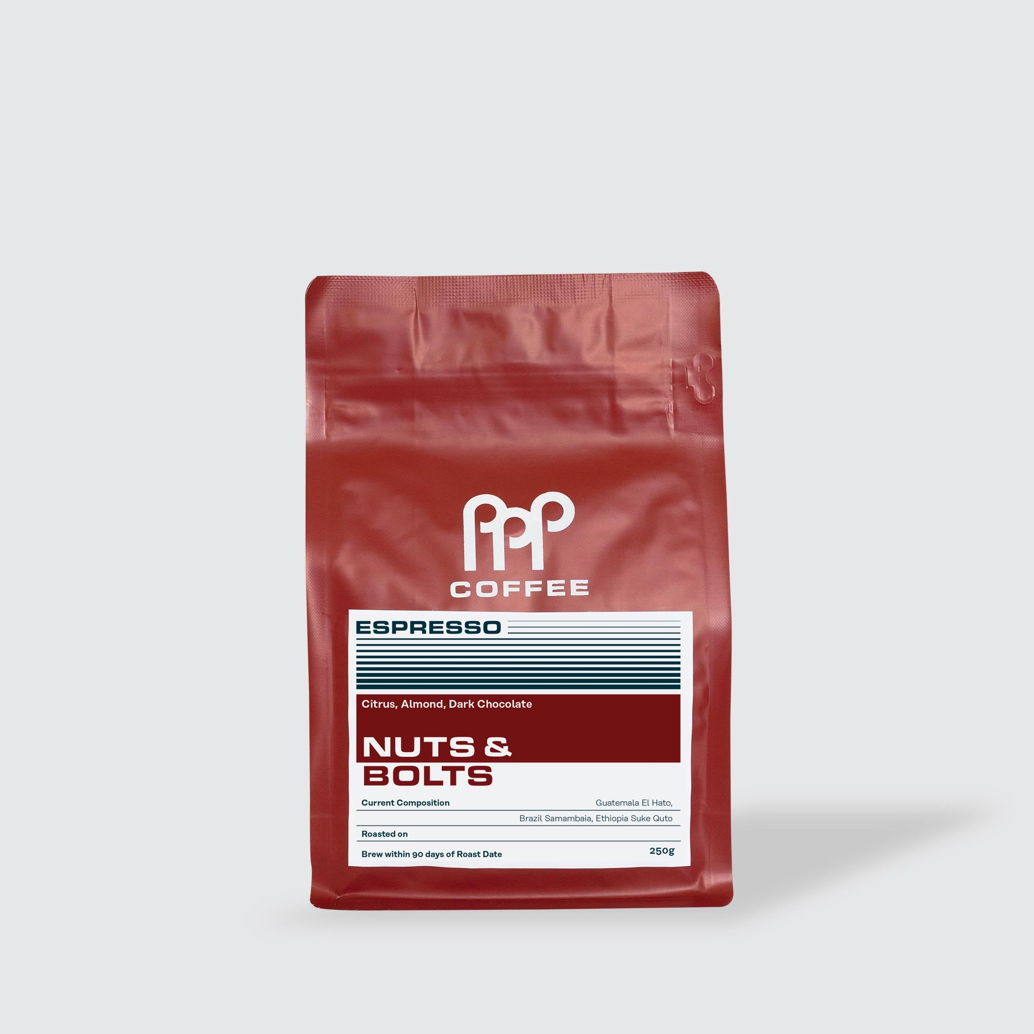 Nuts & Bolts is a blend that has always been a representation of who we are and what we aim to be. This iteration comprises of 3 origins from Guatemala, Brazil and Ethiopia, with a pleasant citrus acidity, yet balanced with a lovely nutty and chocolatey finish.