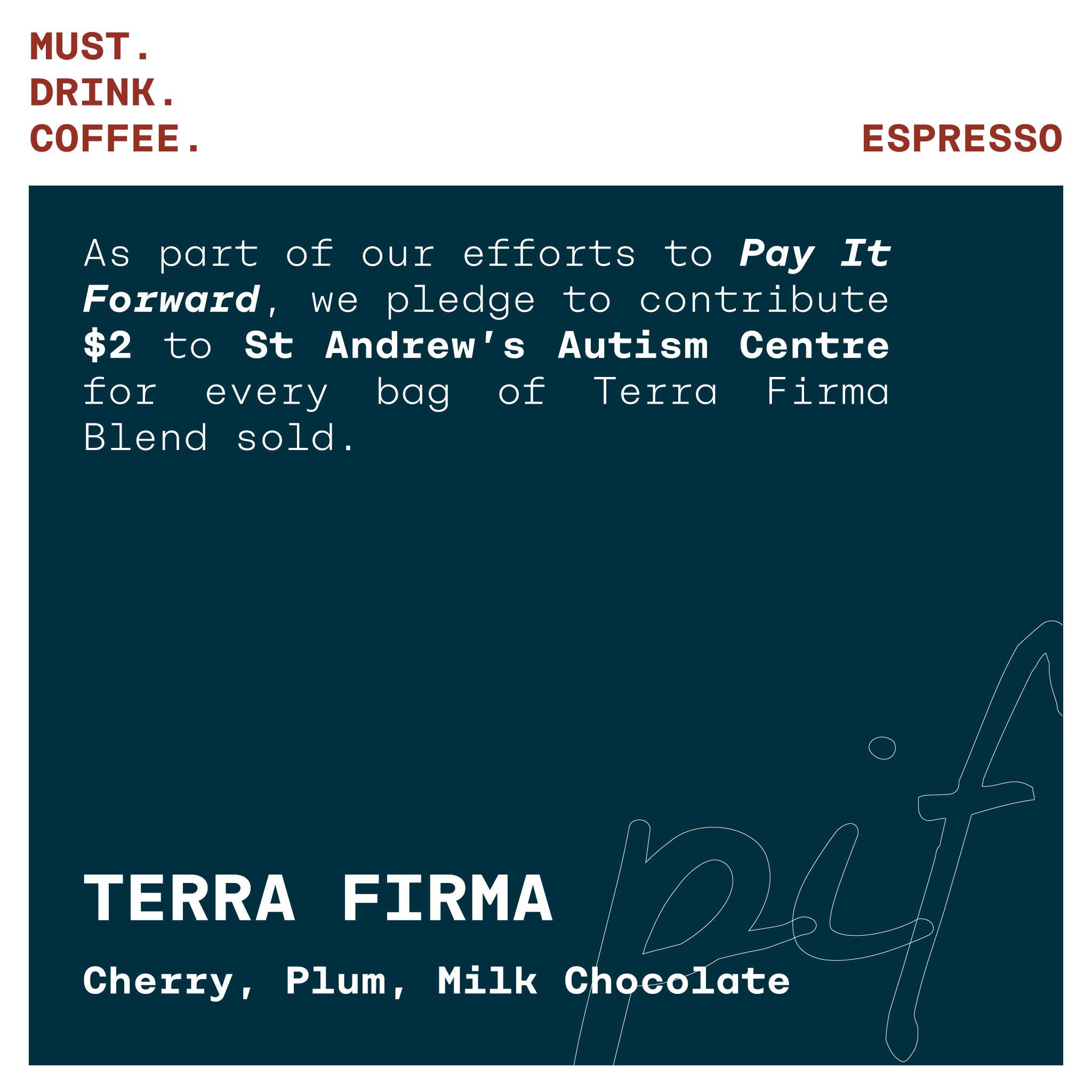 As part of our efforts to Pay It Forward, we pledge to contribute $2 to St Andrew’s Autism Centre for every bag of Terra Firma Blend sold.